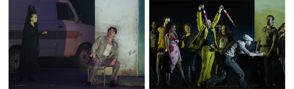 Damiano Michieletto sitúa la acción en los años 70 en un pequeño pueblo mediterráneo y claustrofóbico, en el que Carmen, empoderada y desafiante, rompe las convenciones sociales opresoras y violentas. Un aroma lorquiano fluye por toda la puesta en escena.