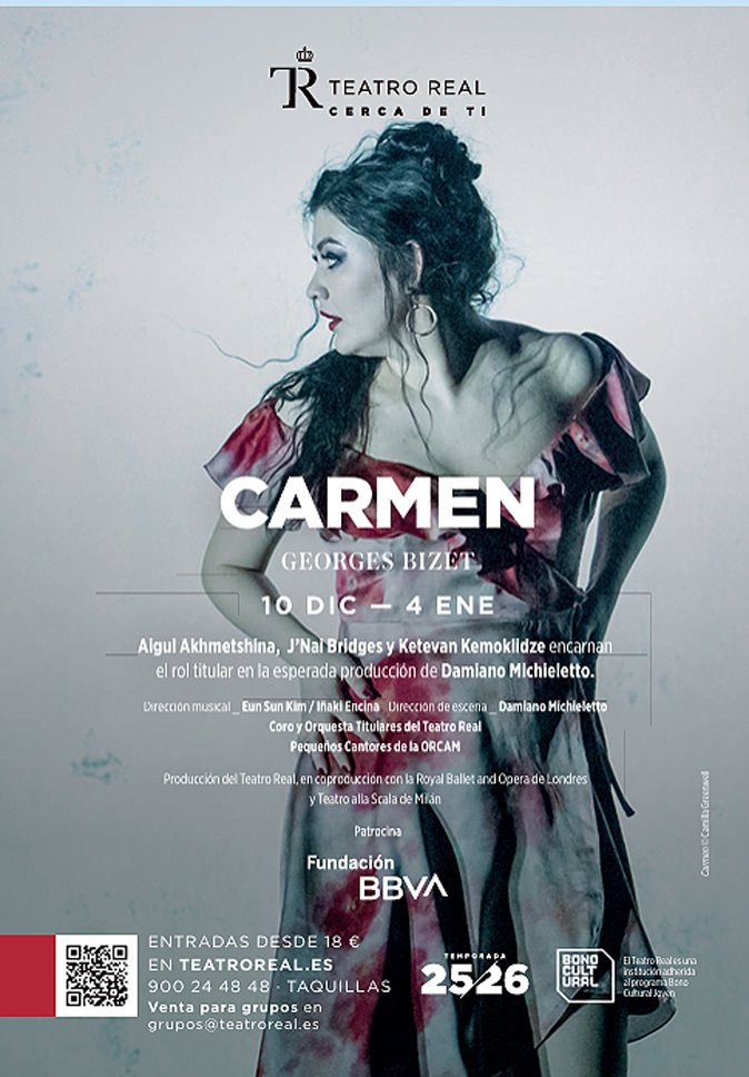 “Carmen” es la última ópera y obra maestra de Georges Bizet, basada en la novela de Prosper Mérimée. El estreno de “Carmen”, produjo un gran escándalo en la Opéra-Comique de París en 1875, por la exaltación de una heroína amoral, intrépida, transgresora, seductora, ajena a las convenciones sociales y dispuesta a luchar por su libertad hasta las últimas consecuencias. Brahms, Chaikovski, Saint-Saëns y, sobre todo, Nietzsche – que la utilizó como contraposición al wagnerismo -, se convertiría posteriormente en un icono del repertorio operístico universal. Sin embargo, su autor, Georges Bizet (1838-1875), murió de un ictus apenas tres meses después de la première, a los 36 años, frustrado y desolado con el recibimiento de la ópera por la que había luchado con denuedo desde su génesis. En esta ocasión llega al Real en coproducción con la Royal Ballet and Opera de Londres – donde se estrenó el año pasado año y se repuso hace unos meses – y el Teatro alla Scala de Milán, donde se presentará el próximo mes de junio.