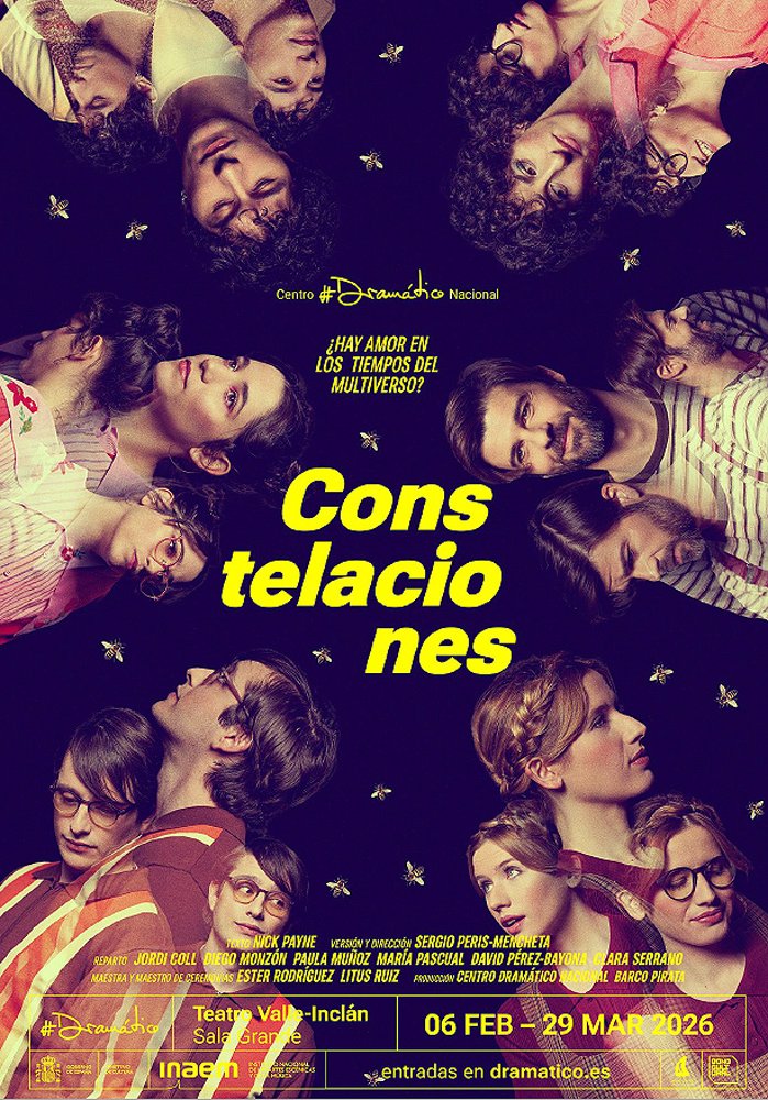 En ese territorio, las cosas no terminan de ocurrir hasta que alguien las mira; la mirada no es neutra, altera. El teatro, de algún modo, nace exactamente ahí: “theatron”, el lugar desde el que se observa. Una función existe porque alguien la mira y, sobre todo, existe de una manera concreta porque se la mira aquí y ahora. Por eso me gusta empezar con un pequeño ritual, un juego que afine la escucha y nos recuerde algo simple: a partir de este momento, vuestra mirada importa. “Constelaciones” es un artefacto perfecto para activar esa idea: una historia de amor atravesada por universos posibles, por bifurcaciones, por versiones simultáneas que solo se vuelven “realidad” cuando una de ellas colapsa ante nuestros ojos.