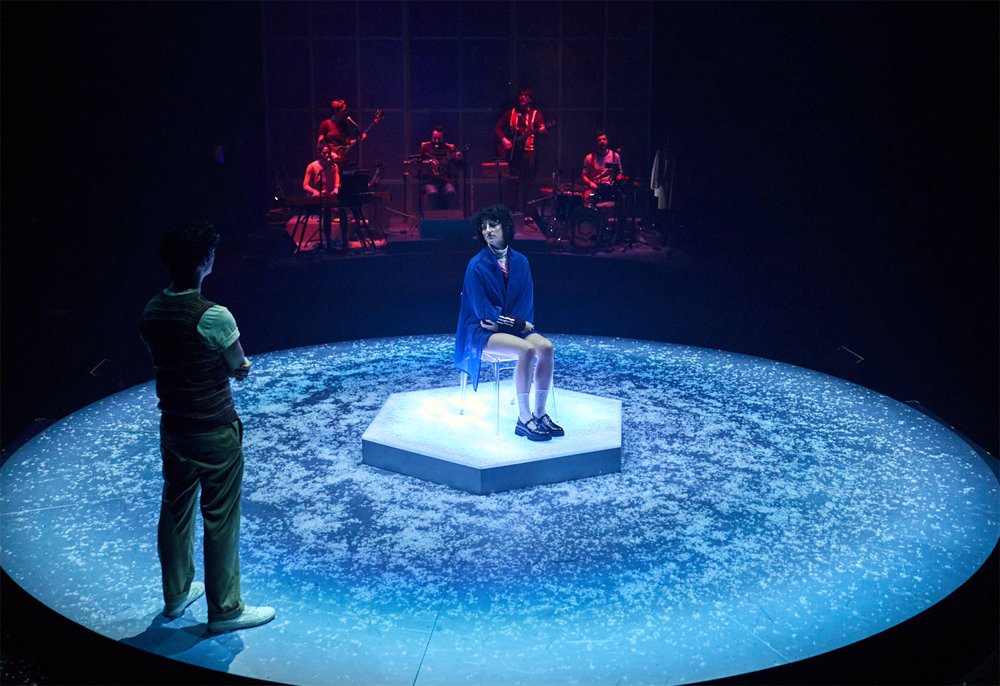Javier Ruiz de Alegría ha creado una escenografía que se transforma delante del espectador, y cumple las expectativas de la idea del multiverso que atraviesa Constelaciones de principio a fin. De estructura fragmentada y poética, la obra convierte una historia de amor en un viaje por realidades paralelas que incluyen la convivencia, la infidelidad, enfermedad, la muerte y el destino. La escenografía se despliega sobre una plataforma circular y giratoria, que rota en ambos sentidos y a distintas velocidades, subrayando la idea de tránsito entre universos. Un espacio escénico frío y prácticamente transparente que contrasta con la calidez del ambiente que envuelve a la banda. La iluminación de Ion Anibal, el vestuario de Elda Noriega AAPEE y la coreografía de Amaya Galeote completan un paisaje escénico que se transforma ante los ojos del espectador.