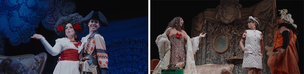 Todos los personajes de “Gato por liebre” tienen una especie de alter ego, y por tanto se sienten identificados con algunos personajes de esta telenovela. Yo no quería que cambiaran tanto de vestuario que no se reconociera que son los mismos cantantes. En eso Rosa en el vestuario ha sido una pieza fundamental. Quería que hubiera una contaminación de ambos personajes. La baronesa, la condesa, la sirvienta y el amante de las tres, porque hay una especie de Serafín que es tremendo, se ven identificados con un personaje de la telenovela. Entonces el juego de identidades, de vestuario, de comicidad es frenético y muy divertido. Los cambios de escenario y parte del vestuario son “a vista”.