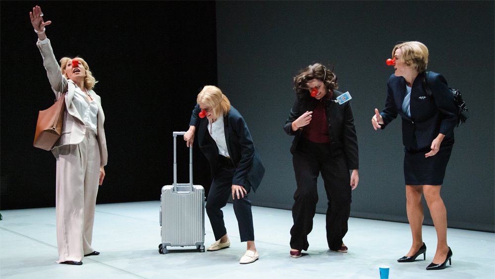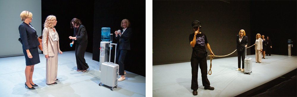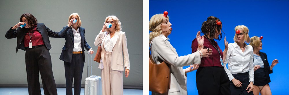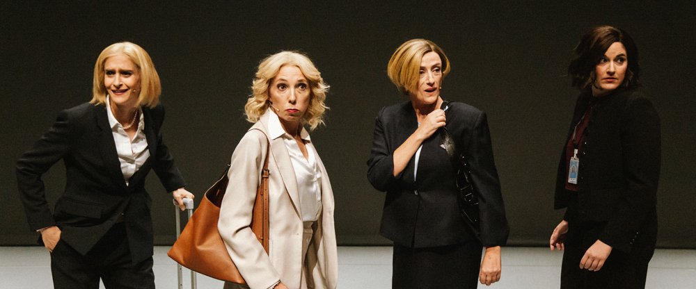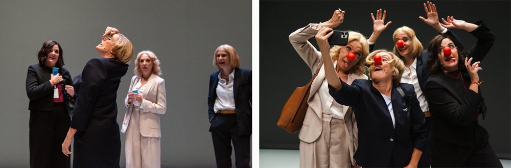 La obra empieza en una pseudo sala de espera, un lugar donde no hay nada. Hay cuatro líderes de ultraderechas encerradas ahí, y a partir de ahí se lían, y el público se pregunta “¿Cómo hemos llegado hasta aquí?” La pieza no es nada situacionista, no es nada psicológica, entonces, nosotras como directoras, nos permitimos hacerla avanzar, viajar y hacer que el teatro sea una herramienta de posibilidad, de lo que puede pasar y no tanto que nos limite a una semblanza de realidad. Hay algo de absurdo, de contemporáneo en lo referente a las artes vivas, a un trato del cuerpo y de la realidad más abierta. También se van a encontrar personajes de ficción, con unas formas muy del ABC del teatro y que hemos mamado, como es la Comedia del Arte, el Clown…Todo eso se engloba en unidad, y ese ha sido nuestro trabajo. Hemos tenido que trazar una fina línea en la cual se engarce las diferentes teatralidades.