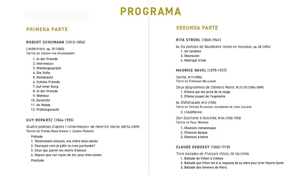 El concierto se abre con Liederkreis, op. 39 de Robert Schumann, inspirado en los poemas de Joseph von Eichendorff, una de las cimas del romanticismo musical. A continuación, se escucharán los delicados Quatre poèmes d’après l’«Intermezzo» de Heinrich Heine de Guy Ropartz, seguidos por tres canciones de Rita Strohl sobre poemas de Charles Baudelaire, ejemplo del sutil lirismo de una de las compositoras francesas más interesantes de su tiempo.