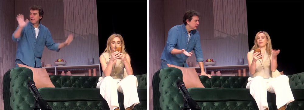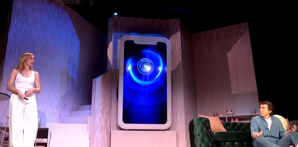 A nivel escenográfico nos encontramos en el interior de esa Casa, diseñada en líneas figurativas, pero no totalmente realistas, y presidida por la pantalla de un gigantesco móvil que nos vigila con su ojo de la cámara, que recuerda aquel ojo electrónico espía de la película “2001, Odisea del espacio” (1968). No es capricho estético, sino que recoge uno de los reproches que se echan en cara Marga y Jaime. Marta Hazas desvela