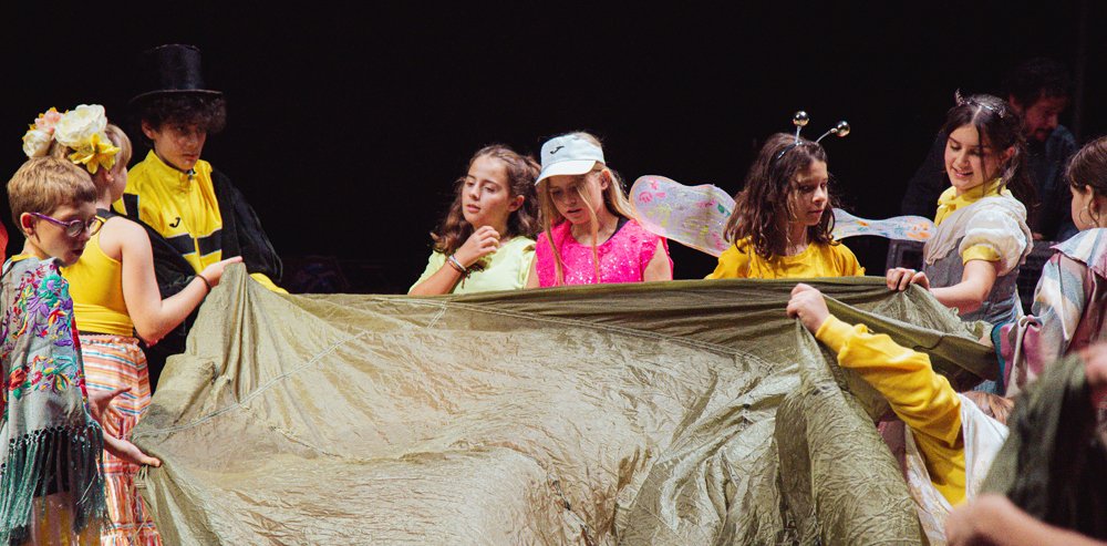 El grupo infantil lo forman 24 niños y niñas, divididos en dos grupos, que comparten escenario con actores profesionales como son Rocío Bello, Chelís Quinzá e Irene Ruiz. Niños y adultos se convierten en un enjambre de personajes que acentúan en tono coral de la obra.